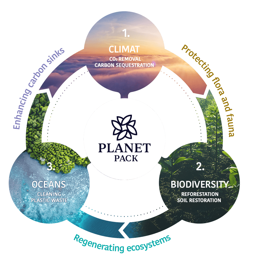 Each Planet Pack™ will automatically activate by triggering 3 quantifiable and certified environmental actions.