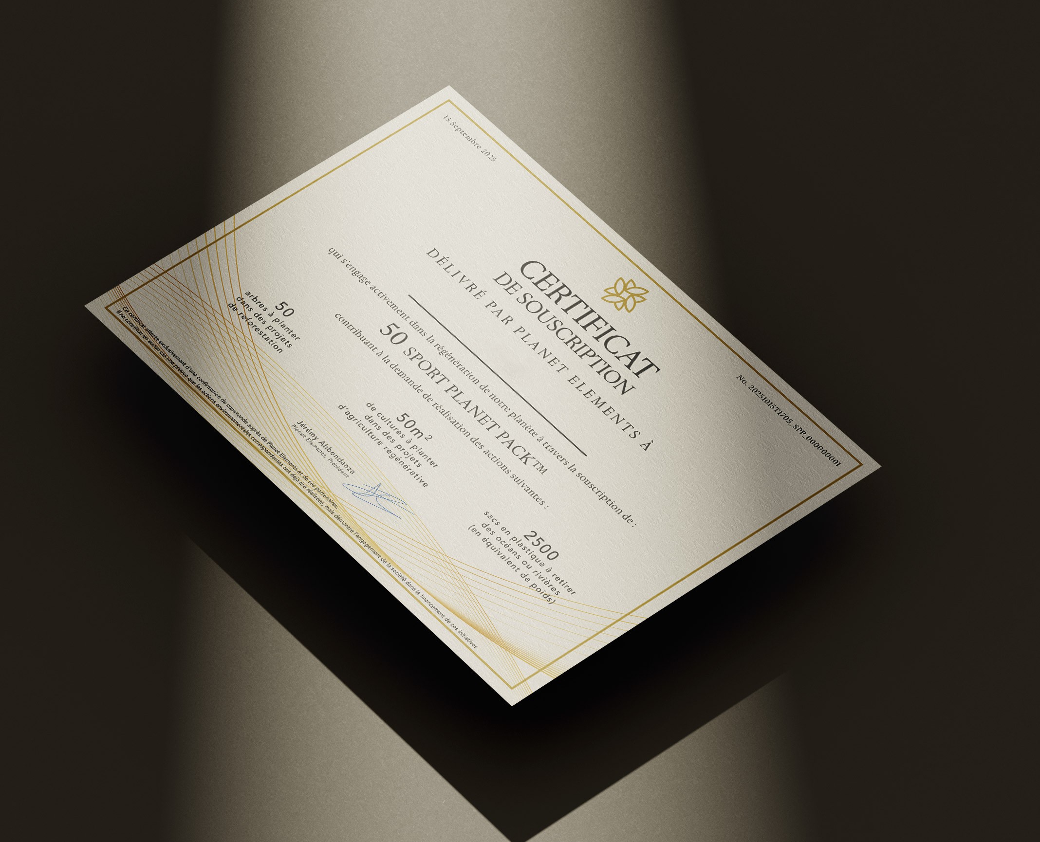 Planet Elements vous délivre des certificats de souscription qui prouvent votre engagement à régénérer la planète ainsi que des certificats de contribution environnementales qui valident l’impact positif des actions exécutées.